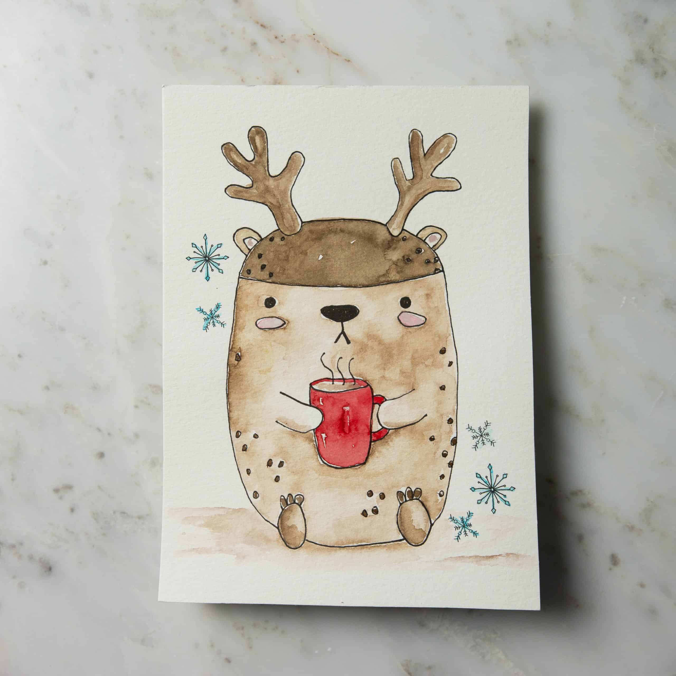 A cheerful bear warms up with a mug of cocoa, his antler hat adding a touch of holiday fun. This scene is a cozy winter moment of simple joy and warm sips.