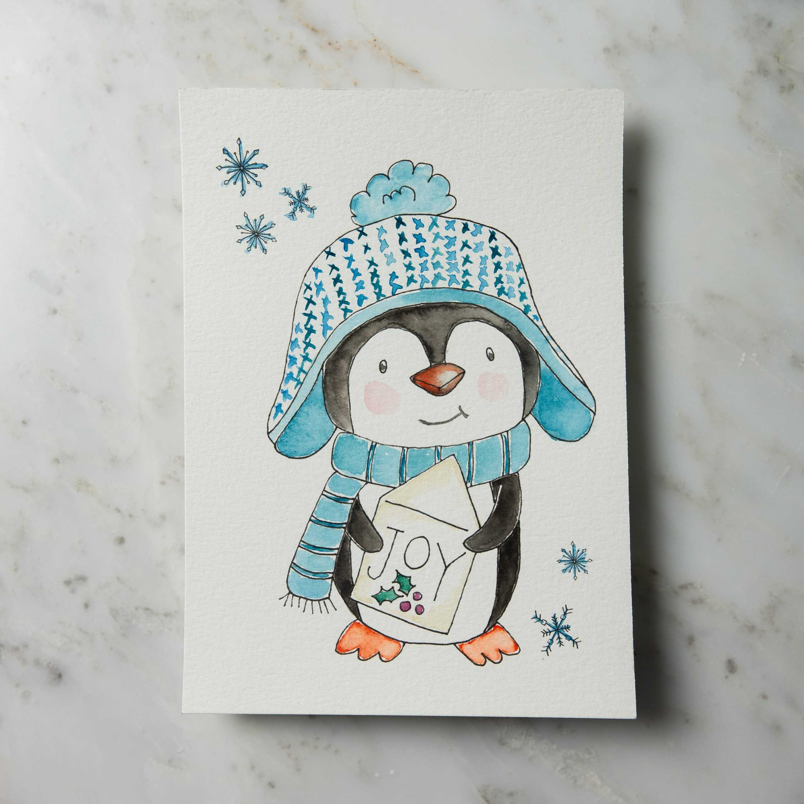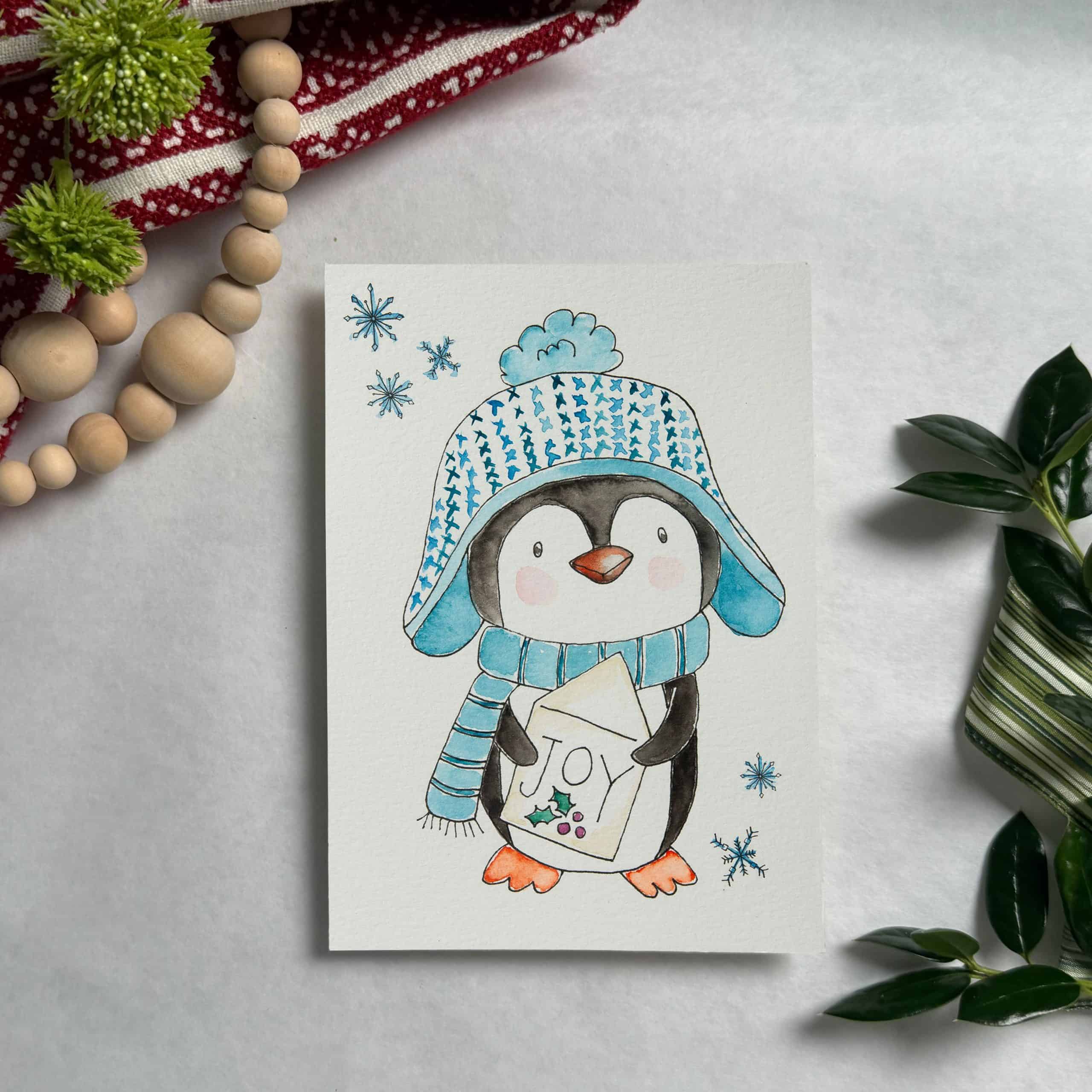 Bundled in a knit hat, this cheerful penguin holds a card that delivers Joy. A messenger of cheer, he brings a smile that warms the heart — a merry nod to my grandson’s love for these charming winter friends.