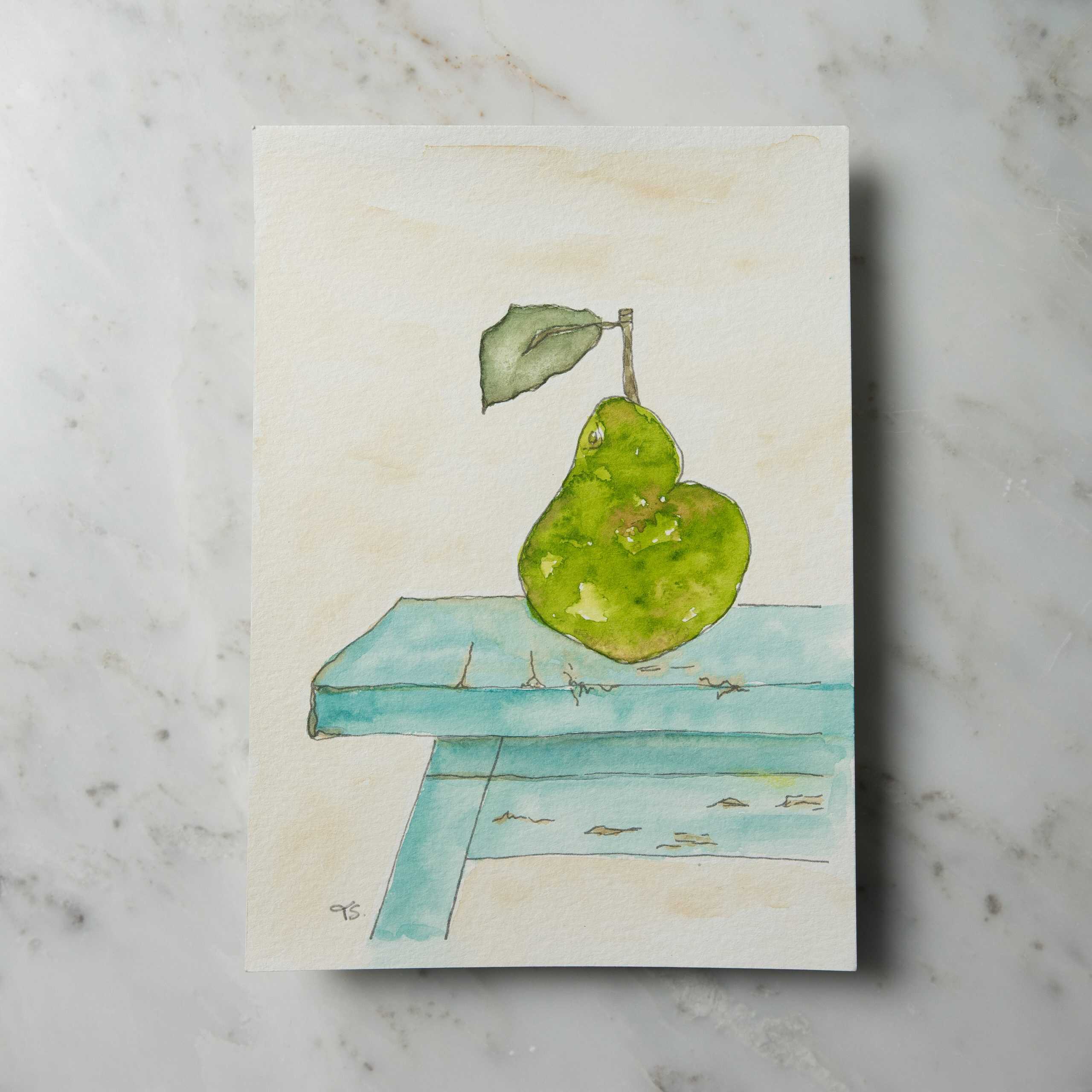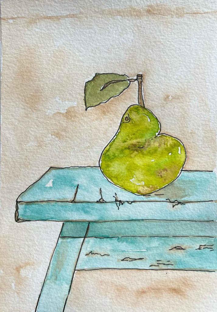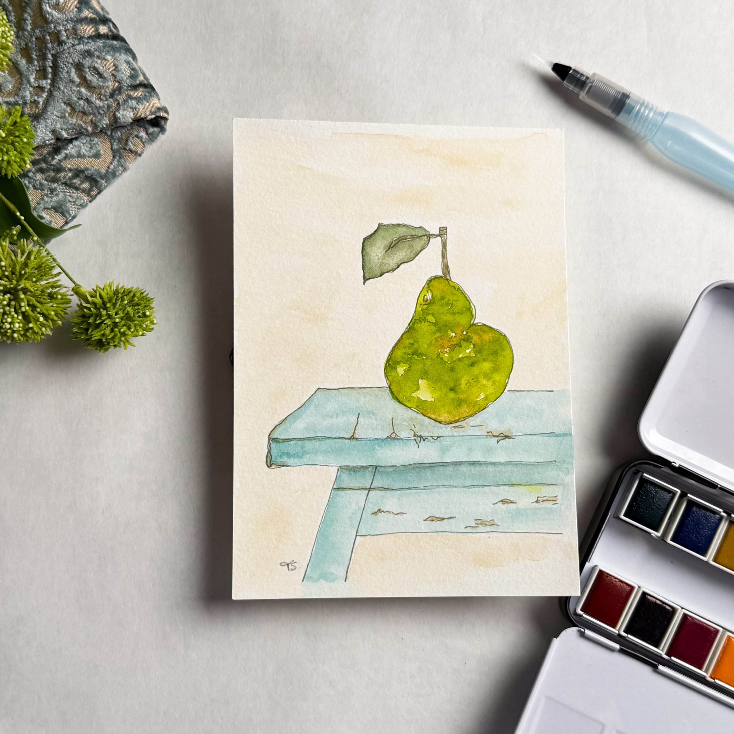 Soft light lingers on a solitary pear, drawing you into a quiet still life moment with brush in hand.